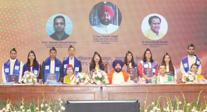 देहरादून 30 दिसम्बर। राज्यपाल एवं कुलाधिपति लेफ्टिनेंट जनरल गुरमीत सिंह (से नि) ने सोमवार को दून विश्वविद्यालय के छठे दीक्षांत समारोह में प्रतिभाग किया। दीक्षांत समारोह के अवसर पर राज्यपाल ने विभिन्न संकायों के 42 छात्र-छात्राओं को स्वर्ण पदक से सम्मानित किया, जिसमें से 34 पदक प्राप्त कर छात्राएँ अव्वल रहीं, जिस पर उन्होंने विशेष प्रसन्नता व्यक्त की। विद्यार्थियों को संबोधित करते हुए राज्यपाल ने कहा कि दीक्षांत केवल उपाधि प्राप्ति का क्षण नहीं, बल्कि छात्र से जिम्मेदार नागरिक बनने की यात्रा का आरम्भ है। उन्होंने इसे अमृत पीढ़ी के परिश्रम, अनुशासन और संकल्प का उत्सव बताया। राज्यपाल ने उपाधि तथा पदक प्राप्त करने वाले सभी मेधावी छात्र-छात्राओं, उनके अभिभावकों और शिक्षकों को हार्दिक बधाई एवं शुभकामनाएँ देते हुए इसे विद्यार्थियों की व्यक्तिगत उपलब्धि के साथ-साथ उनके माता-पिता के त्याग, शिक्षकों के मार्गदर्शन और दून विश्वविद्यालय की सकारात्मक शैक्षणिक संस्कृति का परिणाम बताया। विश्वविद्यालय द्वारा इस वर्ष दीक्षांत समारोह की विषयवस्तु को कृत्रिम बुद्धिमत्ता (एआई) पर केंद्रित किया गया, जिस पर प्रकाश डालते हुए राज्यपाल ने तकनीक और विशेष रूप से आर्टिफिशियल इंटेलिजेंस के संदर्भ में कहा कि वर्तमान समय का यह एक सशक्त माध्यम है, जो शिक्षा, अनुसंधान और कार्यशैली को नई दिशा दे रहा है। अपने सम्बोधन में राज्यपाल ने दीक्षांत समारोह के मुख्य वक्ता एवं आईआईटी बॉम्बे के प्रोफेसर गणेश रामकृष्णन द्वारा ‘BharatGen’ जैसी स्वदेशी एआई पहल का उल्लेख करते हुए कहा कि भारतीय भाषाओं और संस्कृति के अनुरूप तकनीकी समाधान विकसित करने से तकनीक वास्तव में जन-जन तक पहुँचती है। राज्यपाल ने दून विश्वविद्यालय सहित देश की अमृत पीढ़ी के युवाओं से आह्वान किया कि वे एआई का नैतिक, मानवीय और समाजोपयोगी उपयोग करते हुए उत्तराखण्ड की भौगोलिक चुनौतियों और स्थानीय समस्याओं के समाधान हेतु नवाचार-आधारित कार्य करें। इस अवसर पर राज्यपाल ने कहा कि विकसित भारत @2047 का लक्ष्य केवल आर्थिक प्रगति नहीं, बल्कि सामाजिक न्याय, सांस्कृतिक गौरव और मानवीय मूल्यों से युक्त राष्ट्र-निर्माण का संकल्प है, जिसमें युवाओं की भूमिका निर्णायक होगी। उन्होंने राष्ट्रीय शिक्षा नीति-2020 को दूरदर्शी पहल बताते हुए कहा कि इसका उद्देश्य ‘जॉब सीकर’ नहीं, बल्कि ‘जॉब क्रिएटर’ तैयार करना है, और दून विश्वविद्यालय इस दिशा में सार्थक प्रयास कर रहा है। उत्तराखण्ड की भौगोलिक चुनौतियों का उल्लेख करते हुए राज्यपाल ने कहा कि पलायन और आपदा-संवेदनशीलता जैसी समस्याओं का समाधान स्थानीय नवाचार, स्वरोजगार और सतत विकास में निहित है। उन्होंने छात्राओं 