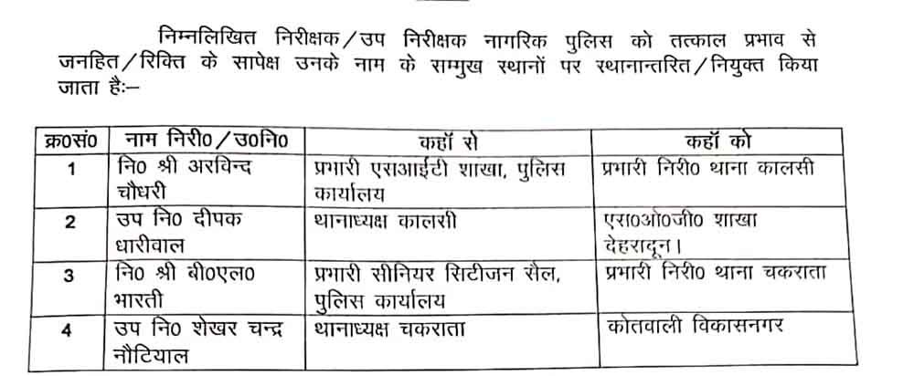 Homeअपराध अपराधउत्तराखंडविविध एसएसपी ने किए इंस्पेक्टरों और सब इंस्पेक्टरों के तबादले, देखें सूची By Web Editor February 4, 2026 0 64 WhatsAppFacebookTwitterEmail देहरादून 5 फरवरी, बुद्धवार देर रात 4 फरवरी को वरिष्ठ पुलिस अधीक्षक देहरादून द्वारा निम्न निरीक्षकों/उप निरीक्षकों के स्थानांतरण उनके नाम के सम्मुख अंकित स्थानों पर किए गए। Share WhatsAppFacebookTwitterEmail Previous articleकैबिनेट मंत्री ने दिलाई नशा मुक्ति की शपथNext articleदेहरादून में उत्तरायणी कैथिक महोत्सव 2026 का भव्य शुभारंभ Web Editor Related Articles Uncategorized पुलिस ने ई-रिक्शा चालक के ब्लाइंड मर्डर किया खुलासा, आरोपी दबोचा उत्तराखंड माघ खिचड़ी भोज में मुख्यमंत्री धामी, खड़ी होली की धुनों पर झूम उठा टनकपुर उत्तराखंड पत्रकार हेम भट्ट पर हुए जानलेवा हमले की निन्दा LEAVE A REPLY Cancel reply Comment: Please enter your comment! Name:* Please enter your name here Email:* You have entered an incorrect email address! Please enter your email address here Website: Save my name, email, and website in this browser for the next time I comment. Stay Connected22,024FansLike0FollowersFollow0SubscribersSubscribe Latest Articles Uncategorized पुलिस ने ई-रिक्शा चालक के ब्लाइंड मर्डर किया खुलासा, आरोपी दबोचा उत्तराखंड माघ खिचड़ी भोज में मुख्यमंत्री धामी, खड़ी होली की धुनों पर झूम उठा टनकपुर उत्तराखंड पत्रकार हेम भट्ट पर हुए जानलेवा हमले की निन्दा उत्तराखंड उत्तरायणी कौथिक महोत्सव में हिलान्स कैंटीन की महिलाएँ बनीं आत्मनिर्भरता की मिसाल उत्तराखंड अर्बन आयुष्मान आरोग्य मंदिर का लोकार्पण, क्षेत्रवासियों को मिलेगा निःशुल्क उपचार का लाभ Load more - Advertisement -