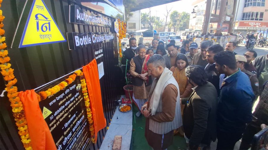 बृहस्पतिवार को नगर निगम परिसर के बाहर मेयर सौरभ थपलियाल और नगर आयुक्त नमामि बंसल द्वारा शहर की पहली ऑटोमेटेड प्लास्टिक बोतल क्रैशर मशीन का उद्घाटन किया गया।