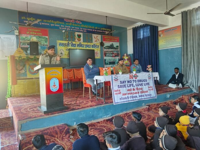 आज थाना डोईवाला पुलिस टीम द्वारा थाना क्षेत्रान्तर्गत स्थित सरस्वती विधा मन्दिर इन्टर कॉलेज कोटि भानियावाला, जौलीग्रान्ट में छात्र-छात्राओं व अध्यापकगणों के साथ जागरूकता कार्यक्रम का आयोजन किया गया। उक्त जागरूकता कार्यक्रम के माध्यम से उपस्थित छात्र-छात्राओं, अध्यापकगणों एवं अभिवावकों को नशे के दुष्प्रभावों के सम्बन्ध में जानकारी देकर नशामुक्त राज्य के स्थापन हेतु पुलिस को सहयोग किये जाने हेतु प्रोत्साहित किया गया। जागरूकता कार्यक्रम में नशामुक्ति से सम्बन्धित फ्लैक्सी/पोस्टर लगाकर उपस्थित लोगों को जन-जागरूकता हेतु नशे के दुष्प्रभावों के सम्बन्ध में जागरूकता पम्पलेट वितरित किये गये। जागरूकता कार्यक्रम मे उपस्थित सभी छात्र-छात्राओ व अध्यापकगण एवं अभिवावको को नशा-मुक्ति के सम्बन्ध मे निर्गत शपथ ग्रहण करायी गयी। जागरूकता कार्यक्रम में उपस्थित छात्र-छात्रों, अध्यापकों एवं अभिवावकों को थाना पुलिस व देहरादून ।छज्थ् टीम के नम्बर उपलब्ध कराये गये। जनपद पुलिस का नशे के विरूद्ध जागरूकता कार्यक्रम लगातार जारी है।