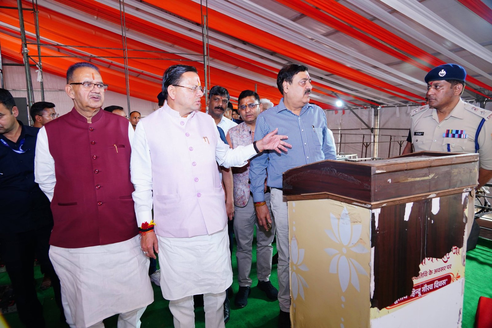 उन्होंने कार्यक्रम स्थल पर सुरक्षा, यातायात प्रबंधन, पार्किंग व्यवस्था, पेयजल, विद्युत आपूर्ति, स्वच्छता एवं अन्य आधारभूत सुविधाओं की तैयारियों की अधिकारियों से जानकारी ली। उन्होंने अधिकारियों को निर्देश दिए कि सभी व्यवस्थाएं समयबद्ध एवं उच्च गुणवत्ता के साथ सुनिश्चित की जाएं, ताकि कार्यक्रम में आने वाले आमजन को किसी प्रकार की असुविधा न हो। मुख्यमंत्री ने विशेष रूप से सुरक्षा व्यवस्था को चाक-चौबंद रखने के निर्देश देते हुए कहा कि सभी एजेंसियों के बीच समन्वय स्थापित कर कार्य किया जाए। उन्होंने यातायात प्रबंधन की सुव्यवस्थित योजना तैयार करने एवं आपातकालीन सेवाओं की त्वरित उपलब्धता सुनिश्चित करने पर भी जोर दिया। जसवंत ग्राउंड में मंच, दर्शक दीर्घा एवं अन्य आवश्यक व्यवस्थाओं के संबंध में अधिकारियों से विस्तृत जानकारी लेते हुए मुख्यमंत्री ने कहा कि कार्यक्रम की गरिमा के अनुरूप सभी तैयारियां पूरी की जाएं। उन्होंने साफ-सफाई एवं सौंदर्यीकरण कार्यों को प्राथमिकता देने के निर्देश भी दिए। मुख्यमंत्री ने मां डाट काली मंदिर में पूजा-अर्चना कर प्रदेश की सुख-समृद्धि एवं कार्यक्रम की सफलता के लिए प्रार्थना की। इस अवसर पर कैबिनेट मंत्री श्री गणेश जोशी, राज्यसभा सांसद श्री महेंद्र भट्ट, सचिव श्री शैलेश बगौली, गढ़वाल कमिश्नर श्री विनय शंकर पाण्डेय, आईजी गढ़वाल श्री राजीव स्वरूप, जिलाधिकारी देहरादून श्री सविन बंसल, अपर सचिव श्री बंशीधर तिवारी, एसएसपी देहरादून श्री प्रमेन्द्र डोभाल एवं विभिन्न विभागों के अधिकारी मौजूद थे।
