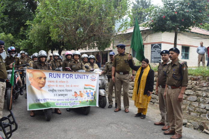बागेश्वर। सरदार वल्लभभाई पटेल की 150वीं जयंती पर “एक भारत, श्रेष्ठ भारत” थीम के अंतर्गत Run For Unity हेतु बागेश्वर पुलिस द्वारा किया बाईक रैली का आयोजन।लौह पुरुष सरदार वल्लभभाई पटेल की 150वीं जयंती 31 अक्टूबर–राष्ट्रीय एकता दिवस के अवसर पर, आज पुलिस अधीक्षक बागेश्वर चन्द्रशेखर घोडके के निर्देशन में बागेश्वर पुलिस द्वारा जन-जागरूकता हेतु कोतवाली नगर क्षेत्र में बाइक रैली का आयोजन किया गया। उक्त बाइक रैली को उप जिलाधिकारी महोदया, बागेश्वर श्वीमती प्रियंका रानी व पुलिस उपाधीक्षक, महोदय बागेश्वर श्री अजय साह, पुलिस उपाधीक्षक कपकोट श्री मनीष शर्मा द्वारा संयुक्त रुप से तहसील परिसर बागेश्वर से हरी झंडी दिखाकर रवाना किया गया। उक्त बाइक रैली से जनता को नशामुक्त जीवन जीने, साइबर अपराध की रोकथाम, नये कानूनों की जानकारी तथा यातायात नियमों के पालन के प्रति जागरूक किया गया। इस अवसर पर “एक भारत, श्रेष्ठ भारत” की भावना के अंतर्गत युवाओं को राष्ट्रीय एकता, अखंडता एवं देश की सुरक्षा में प्रत्येक नागरिक की भूमिका के प्रति प्रेरित किया गया।