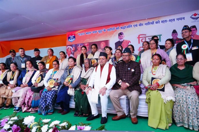 पिथौरागढ़, 17 दिसंबर। मुख्यमंत्री पुष्कर सिंह धामी ने आज विजय दिवस के अवसर पर गांधी पार्क देहरादून में आयोजित श्रद्धांजलि सभा एवं सम्मान समारोह कार्यक्रम में प्रतिभाग किया। उन्होंने शहीद स्मारक पर पुष्पचक्र अर्पित कर वीर बलिदानियों को श्रद्धांजलि दी। इस अवसर पर उन्होंने 1971 के युद्ध के सैनिकों और शहीदों के परिजनों को सम्मानित भी किया। कार्यक्रम में मुख्यमंत्री ने सैनिक कल्याण निदेशालय और जिला सैनिक कल्याण कार्यालय (डीडीहाट, हरबर्टपुर, पिथौरागढ़ एवं हरिद्वार) में सरकारी वाहन उपलब्ध कराने की घोषणा की। मुख्यमंत्री ने विजय दिवस की शुभकामनाएं देते हुए कहा कि हमारे वीर जवानों ने अदम्य साहस और सर्वोच्च बलिदान से 1971 के युद्ध में राष्ट्र की अखंडता और स्वाभिमान की रक्षा की। आज भारतीय सेना के शौर्य, त्याग और अटूट राष्ट्रनिष्ठा की गौरवगाथा को स्मरण करने का दिन है, जो हमारे इतिहास के पन्नों पर स्वर्णाक्षरों में अंकित है। उन्होंने कहा कि 1971 में पाकिस्तान के लगभग 93 हजार सैनिकों ने हमारी सेना के समक्ष आत्मसमर्पण किया। इस युद्ध में वीरभूमि उत्तराखण्ड के 248 बहादुर सपूतों ने भी अपना सर्वोच्च बलिदान दिया। हमारे प्रदेश के 74 सैनिकों को अपने अदम्य साहस और शौर्य के लिए विभिन्न वीरता पदकों से सम्मानित भी किया गया था। उत्तराखण्ड के लगभग प्रत्येक परिवार का कोई न कोई सदस्य सेना में है। मुख्यमंत्री ने कहा कि प्रधानमंत्री नरेंद्र मोदी के नेतृत्व में जवानों का मनोबल बढ़ाने के साथ ही सेना को अत्याधुनिक तकनीक और हथियारों से सुसज्जित किया जा रहा है। भारत रक्षा सामग्री का निर्यात करने वाले शीर्ष देशों की सूची में शामिल हो गया है। ऑपरेशन सिंधु के माध्यम से भारत ने यह सिद्ध कर दिया कि हमारे सैनिकों के साथ-साथ हमारे स्वदेशी हथियार भी किसी से कम नहीं हैं। इस अभियान में भारत में निर्मित आकाश मिसाइल, डिफेंस सिस्टम और ब्रह्मोस मिसाइल जैसे स्वदेशी हथियारों ने पूरे विश्व में भारत का डंका बजा दिया। आज दुश्मन की एक-एक गोली का जवाब गोलों से दिया जा रहा है। मुख्यमंत्री ने कहा कि यह नया भारत है, जो दुश्मनों की हर नापाक हरकत का करारा जवाब देता है और उन्हें उनके ठिकानों में ही नेस्तनाबूद कर देता है। उन्होंने कहा कि प्रधानमंत्री के नेतृत्व में वीर जवानों के हित में भी कई महत्वपूर्ण निर्णय लिए जा रहे हैं। वन रैंक वन पेंशन योजना हो, नेशनल वॉर मेमोरियल का निर्माण, रक्षा बजट में वृद्धि कर सैनिकों की सभी आवश्यकताओं की पूर्ति करना हो, या बॉर्डर पर इन्फ्रास्ट्रक्चर को मजबूत बनाना, ऐसे अनेक कार्य किए गए हैं। मुख्यमंत्री ने कहा कि प्रधानमंत्री के मार्गदर्शन में प्रदेश सरकार भी सैनिकों और उनके परिवारों के कल्याण के ल