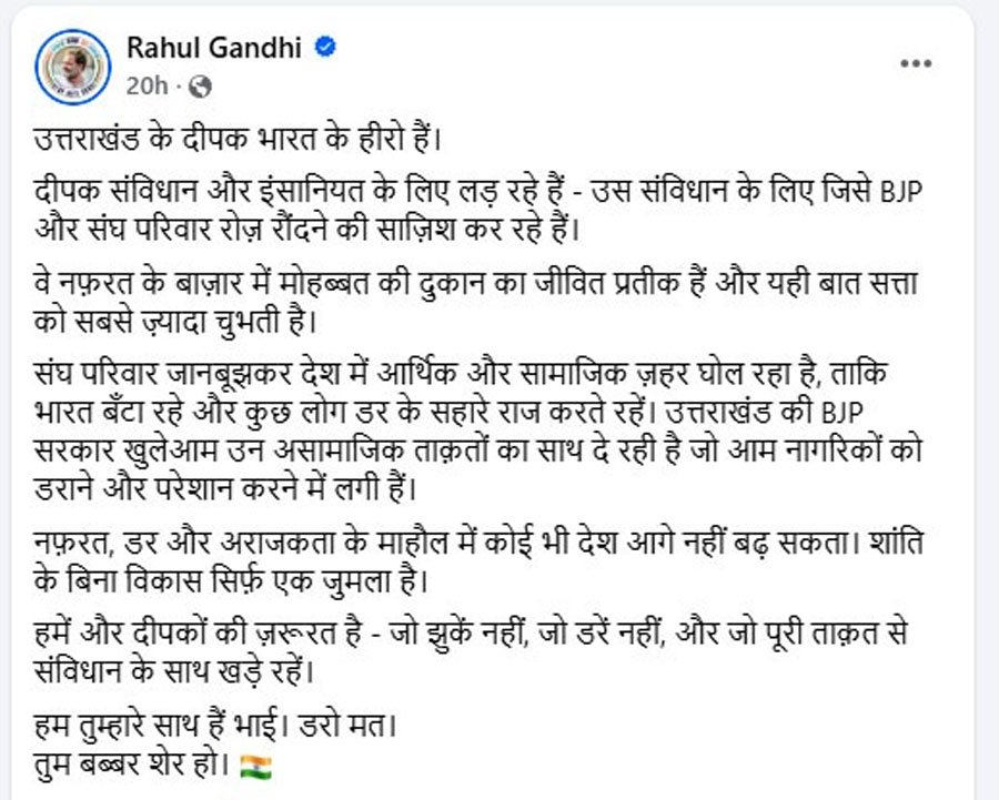 कोटद्वार 02 फरवरी। कोटद्वार बवाल तूल पकड़ता जा रहा है। अब इस मामले मे कांग्रेस सांसद और लोकसभा में विपक्ष के नेता राहुल गांधी ने एक्स पर ट्वीट कर मोहम्मद दीपक को हीरो बताया है। उन्होंने लिखा कि उत्तराखंड के दीपक भारत के हीरो हैं। दीपक संविधान और इंसानियत के लिए लड़ रहे हैं। उस संविधान के लिए जिसे बीजेपी और संघ परिवार रोज़ रौंदने की साजिश कर रहे हैं। वे नफरत के बाज़ार में मोहब्बत की दुकान का जीवित प्रतीक हैं और यही बात सत्ता को सबसे ज़्यादा चुभती है। संघ परिवार जानबूझकर देश में आर्थिक और सामाजिक ज़हर घोल रहा है, ताकि भारत बंटा रहे और कुछ लोग डर के सहारे राज करते रहें। उत्तराखंड की बीजेपी सरकार खुलेआम उन असामाजिक ताक़तों का साथ दे रही है जो आम नागरिकों को डराने और परेशान करने में लगी हैं। नफरत, डर और अराजकता के माहौल में कोई भी देश आगे नहीं बढ़ सकता। शांति के बिना विकास सिर्फ एक जुमला है। हमें और दीपकों की ज़रूरत है, जो झुकें नहीं, जो डरें नहीं, और जो पूरी ताकत से संविधान के साथ खड़े रहें। हम तुम्हारे साथ हैं भाई। डरो मत। तुम बब्बर शेर हो।