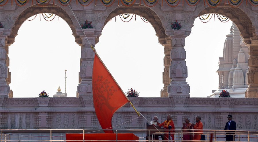 अयोध्या। राष्ट्र के सामाजिक-सांस्कृतिक और आध्यात्मिक परिदृश्य में एक महत्वपूर्ण अवसर पर, प्रधानमंत्री श्री नरेन्द्र मोदी ने आज उत्तर प्रदेश के अयोध्या में पवित्र श्री राम जन्मभूमि मंदिर के शिखर पर भगवा ध्वज फहराया। ध्वजारोहण उत्सव मंदिर निर्माण के पूर्ण होने और सांस्कृतिक उत्सव एवं राष्ट्रीय एकता के एक नए अध्याय की शुरुआत का प्रतीक है। इस अवसर पर उपस्थित जनसमूह को संबोधित करते हुए, प्रधानमंत्री ने कहा कि आज अयोध्या नगरी भारत की सांस्कृतिक चेतना के एक और शिखर का साक्षी बन रही है। श्री मोदी ने कहा, “आज पूरा भारत और पूरा विश्व भगवान श्री राम की भावना से ओतप्रोत है।” उन्होंने इस बात पर प्रकाश डाला कि प्रत्येक रामभक्त के हृदय में अद्वितीय संतोष, असीम कृतज्ञता और अपार दिव्य आनंद है। उन्होंने इस बात पर ज़ोर दिया कि सदियों पुराने घाव भर रहे हैं, सदियों का दर्द समाप्त हो रहा है और सदियों का संकल्प आज सिद्ध हो रहा है। उन्होंने घोषणा की कि यह उस यज्ञ की परिणति है जिसकी अग्नि 500 वर्षों तक प्रज्वलित रही, एक ऐसा यज्ञ जिसकी आस्था कभी डगमगाई नहीं, एक क्षण के लिए भी आस्था खंडित नहीं हुई। उन्होंने रेखांकित किया कि आज भगवान श्री राम के गर्भगृह की अनंत ऊर्जा और श्री राम परिवार की दिव्य महिमा इस धर्म ध्वज के रूप में इस दिव्यतम एवं भव्य मंदिर में प्रतिष्ठित हुई है। श्री मोदी ने ज़ोर देकर कहा, “यह धर्म ध्वज केवल एक ध्वज नहीं, बल्कि भारतीय सभ्यता के पुनर्जागरण का ध्वज है।” उन्होंने बताया कि इसका केसरिया रंग, इस पर अंकित सूर्यवंश की महिमा, पवित्र ॐ का चित्रण और उत्कीर्ण कोविदर वृक्ष रामराज्य की महानता के प्रतीक हैं। उन्होंने कहा कि यह ध्वज संकल्प है, यह ध्वज सिद्धि है, यह ध्वज संघर्ष से सृजन की गाथा है, यह ध्वज सदियों से संजोए गए स्वप्नों का मूर्त रूप है और यह ध्वज संतों की तपस्या और समाज की सहभागिता की सार्थक परिणति है। यह घोषणा करते हुए कि आने वाली सदियों और सहस्राब्दियों तक, यह धर्म ध्वज भगवान राम के आदर्शों और सिद्धांतों का उद्घोष करेगा, श्री मोदी ने ज़ोर देकर कहा कि यह आह्वान करेगा कि विजय केवल सत्य की होती है, असत्य की नहीं। उन्होंने इस बात पर ज़ोर दिया कि यह उद्घोषणा करेगा कि सत्य स्वयं ब्रह्म का रूप है और सत्य में ही धर्म की स्थापना होती है। उन्होंने टिप्पणी की कि यह धर्म ध्वज जो कहा गया है उसे अवश्य पूरा करने के संकल्प को प्रेरित करेगा। उन्होंने रेखांकित किया कि यह संदेश देगा कि संसार में कर्म और कर्तव्य को ही प्रधानता देनी चाहिए। उन्होंने कहा कि यह भेदभाव और पीड़ा से मुक्ति और समाज में शांति और सुख की उपस्थिति की कामना व्यक्त करेगा। उन्होंने ज़ोर देकर कहा कि यह धर्म ध्वज हमें इस संकल्प के 