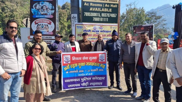 पौड़ी, 19 जनवरी। यातायात कोटद्वार पुलिस द्वारा सड़क सुरक्षा माह 2026 के अंतर्गत निरंतर सड़क सुरक्षा अभियान चलाते हुए आमजन एवं वाहन चालकों को यातायात नियमों के प्रति जागरूक किया जा रहा है। सर्दियों के मौसम में कोहरे व कम दृश्यता के कारण होने वाली सड़क दुर्घटनाओं की रोकथाम हेतु यातायात कोटद्वार एवं रोटरी क्लब कोटद्वार के संयुक्त सहयोग से वाहनों में रिफ्लेक्टर टेप लगाए गए। रिफ्लेक्टर टेप अंधेरे, कोहरे एवं रात्रि के समय दूर से ही वाहन की उपस्थिति को स्पष्ट करता है, जिससे पीछे से आने वाले वाहन चालक समय रहते सतर्क हो जाते हैं और दुर्घटनाओं की संभावना में कमी आती है। इस दौरान पुलिस द्वारा वाहन चालकों को अपने वाहनों पर अनिवार्य रूप से रिफ्लेक्टर टेप लगाने, नियंत्रित गति बनाए रखने, फॉग लाइट का सही प्रयोग करने तथा यातायात नियमों का पालन करने हेतु प्रेरित किया गया।
