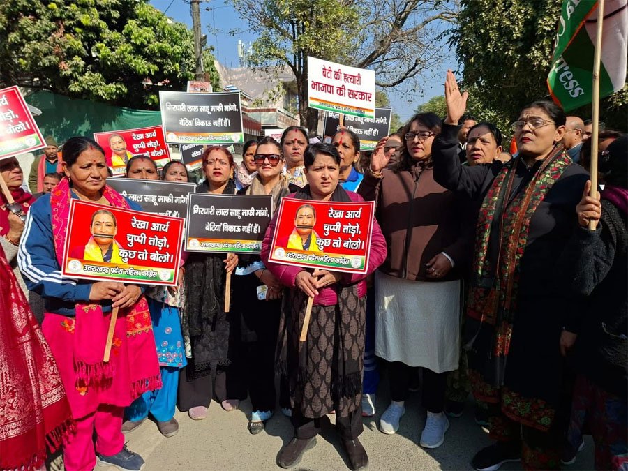 देहरादून, 03 जनवरी। आज उत्तराखंड प्रदेश महिला कांग्रेस ने महिला सशक्तिकरण एवं बाल विकास मंत्री रेखा आर्य के यमुना कॉलोनी स्थित आवास का घेराव कर अपना कड़ा विरोध दर्ज कराया। अंकिता भंडारी हत्याकांड में भाजपा के वीआईपी नाम सामने आने के बावजूद मंत्री रेखा आर्य खामोश हैं, मंत्री जी के पति सार्वजनिक मंच से कहते हैं कि बिहार से 20–25 हज़ार रुपये में लड़कियाँ खरीदी जाती हैं। हमारी माँग है कि मंत्री और उनके पति इस घृणित बयान पर तुरंत सार्वजनिक माफी माँगें, उन पर न्यायसंगत कार्रवाई हो।