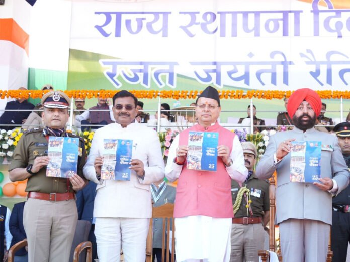 देहरादून।उत्तराखण्ड राज्य स्थापना के रजत जयंती समारोह के अवसर पर गुरुवार को पुलिस लाइन, देहरादून में आयोजित कार्यक्रम में राज्यपाल लेफ्टिनेंट जनरल गुरमीत सिंह (से नि) एवं मुख्यमंत्री श्री पुष्कर सिंह धामी ने प्रतिभाग किया। राज्यपाल ने इस अवसर पर आयोजित रैतिक परेड का निरीक्षण कर सलामी ली। राष्ट्रीय गीत ‘‘वंदे मातरम’’ के 150 वर्ष पूर्ण होने के अवसर पर कार्यक्रम की शुरुआत वंदे मातरम गीत से हुई। इस अवसर पर राज्यपाल एवं मुख्यमंत्री द्वारा ‘‘उत्तराखण्ड पुलिस पत्रिका-2025’’ का विमोचन एवं रजत जयंती पदक के प्रतीकात्मक चिन्ह का अनावरण किया गया।