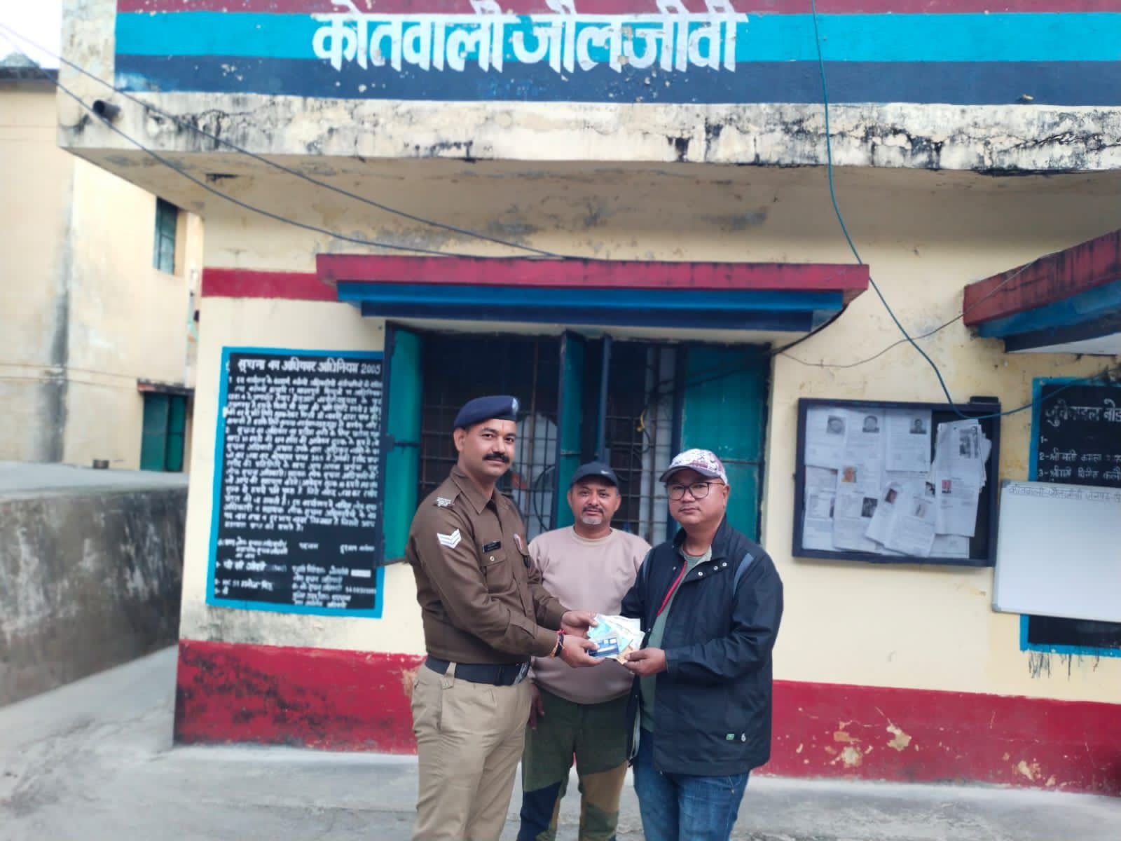 पिथौरागढ़। कोतवाली जौलजीबी में तैनात हेड कास्टेबल महेश पन्त की तत्परता व सूझ-बूझ तथा जीआईसी जौलजीबी के स्कूली बच्चों की ईमानदार पहल से एक खोया हुआ पर्स उसके सही स्वामी तक सुरक्षित पहुंचाया गया। जीआईसी जौलजीबी के कुछ छात्रों को सड़क पर एक पर्स गिरा हुआ मिला, जिसे उन्होंने बिना देर किए कोतवाली जौलजीबी में जमा कराया। पर्स में रुपये 3500 नगद, एटीएम कार्ड, डीएल, पैन कार्ड सहित कई महत्वपूर्ण दस्तावेज थे। हेड कांस्टेबल महेश पन्त द्वारा पर्स में मिले आईडी व डीएल के आधार पर बैंक व आरटीओ कार्यालय से संपर्क कर पर्स स्वामी की जानकारी प्राप्त की गई। पता चला कि पर्स आयुष निवासी बरेली (उत्तर प्रदेश) का है, जो धारचूला आया हुआ था और रास्ते में उसका पर्स खो गया था, जिससे वह अत्यधिक परेशान था। पुलिस द्वारा पर्स, रुपये और सभी दस्तावेजों को विधिवत सत्यापन के उपरांत आयुष के मामा के सुपुर्द किया गया। पर्स वापस मिलने पर आयुष व उसके परिजनों ने अत्यधिक प्रसन्नता व्यक्त करते हुए पिथौरागढ़ पुलिस एवं जीआईसी जौलजीबी के बच्चों की ईमानदारी और मानवीय संवेदनशीलता की भूरि-भूरि प्रशंसा की। जनपद पिथौरागढ़ पुलिस आमजन की सुरक्षा, सहायता व विश्वास को सर्वोपरि रखते हुए इसी प्रकार मानवता व सेवा भाव के साथ कार्य करने हेतु संकल्पबद्ध है।